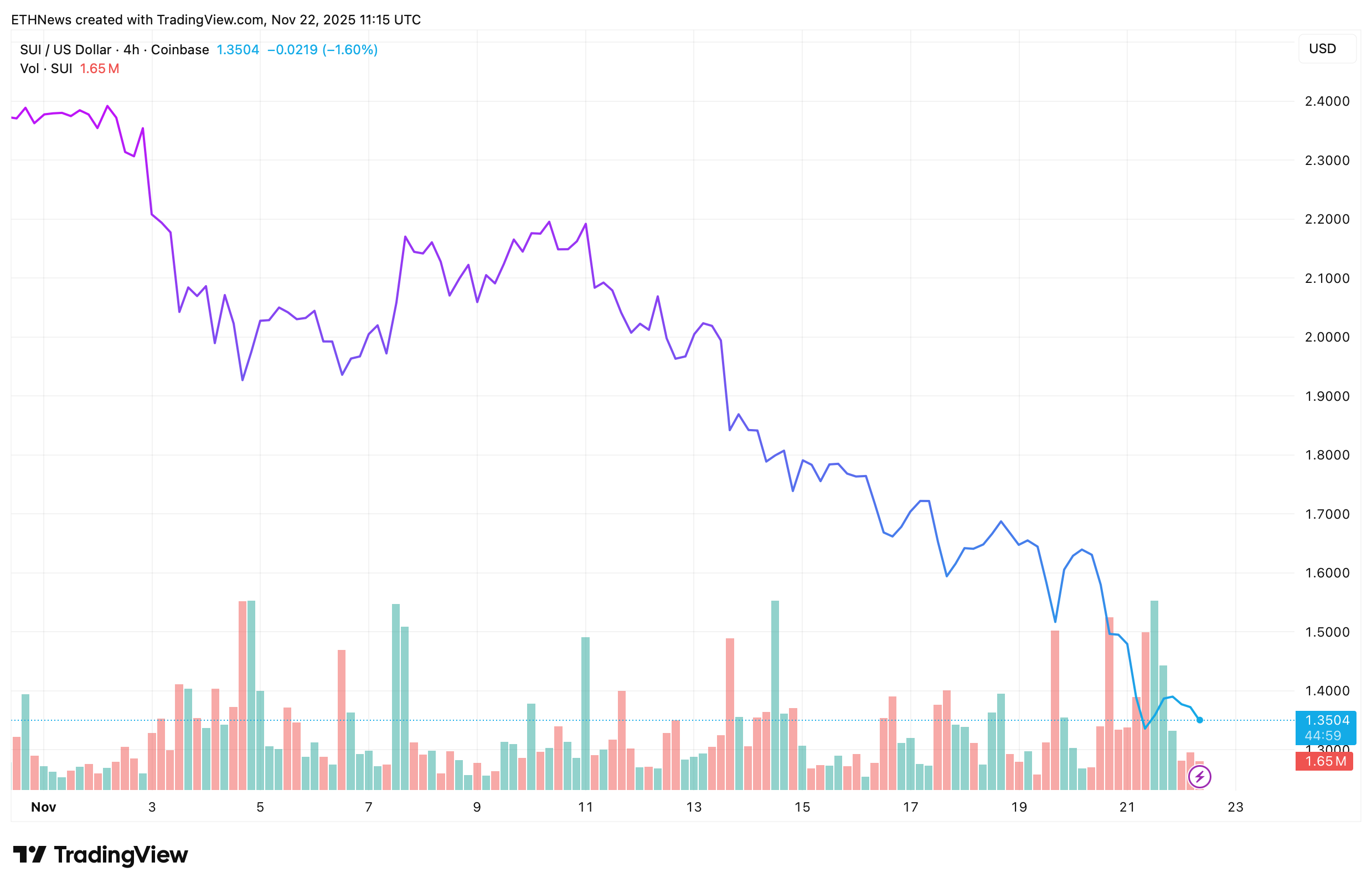 On the 4-hour TradingView chart, SUI continues a clear downward trajectory throughout November, falling steadily from above $2.40 to the current $1.35 range.