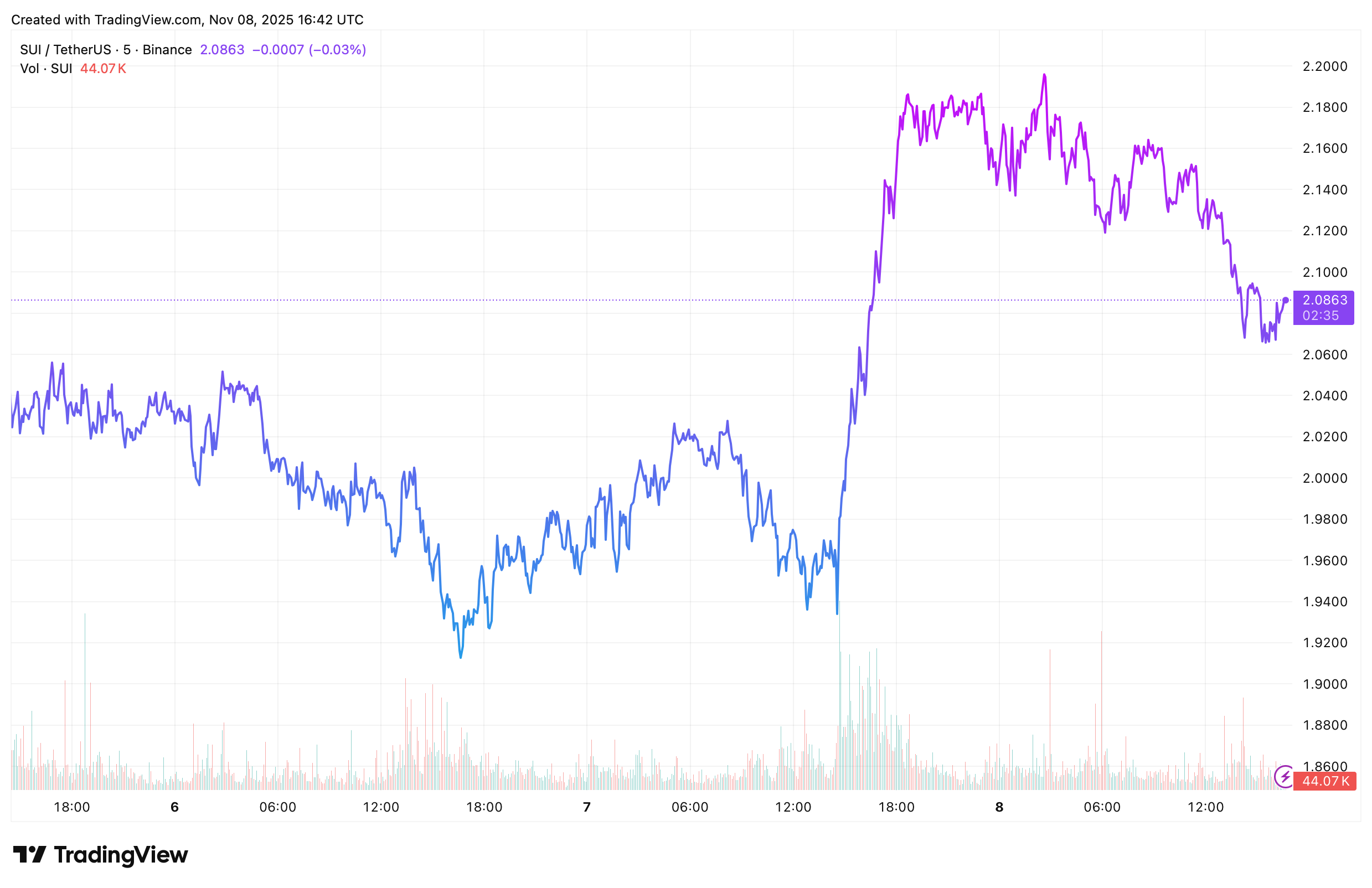 The white TradingView chart clearly illustrates SUI’s volatile intraday movement, steep drops followed by quick, shallow recoveries. The most recent action shows a double-bottom formation, a classic technical indicator that often precedes a rebound. However, the bounce has been weak, failing to break through overhead resistance near $2.1.
