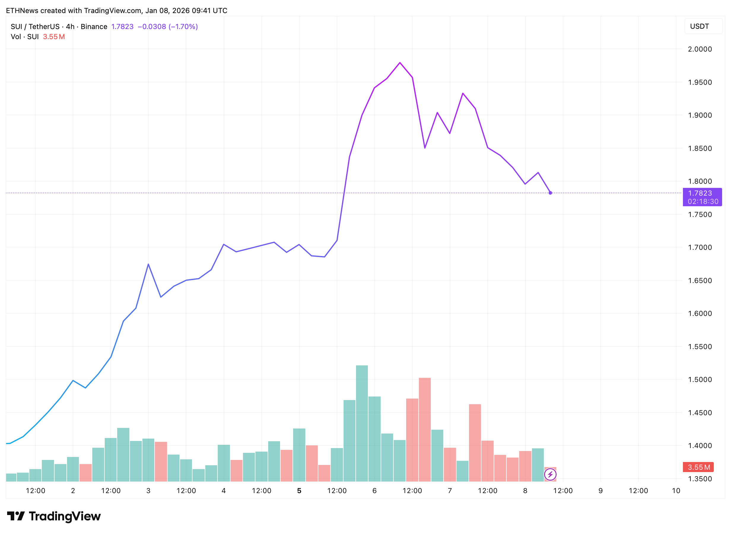 The latest chart by TradingView provides additional clarity on the current setup. SUI is trading near $1.78–$1.82, consolidating above the prior resistance zone that has now flipped into support. This area between $1.70 and $1.75represents the primary level to watch in the short term.