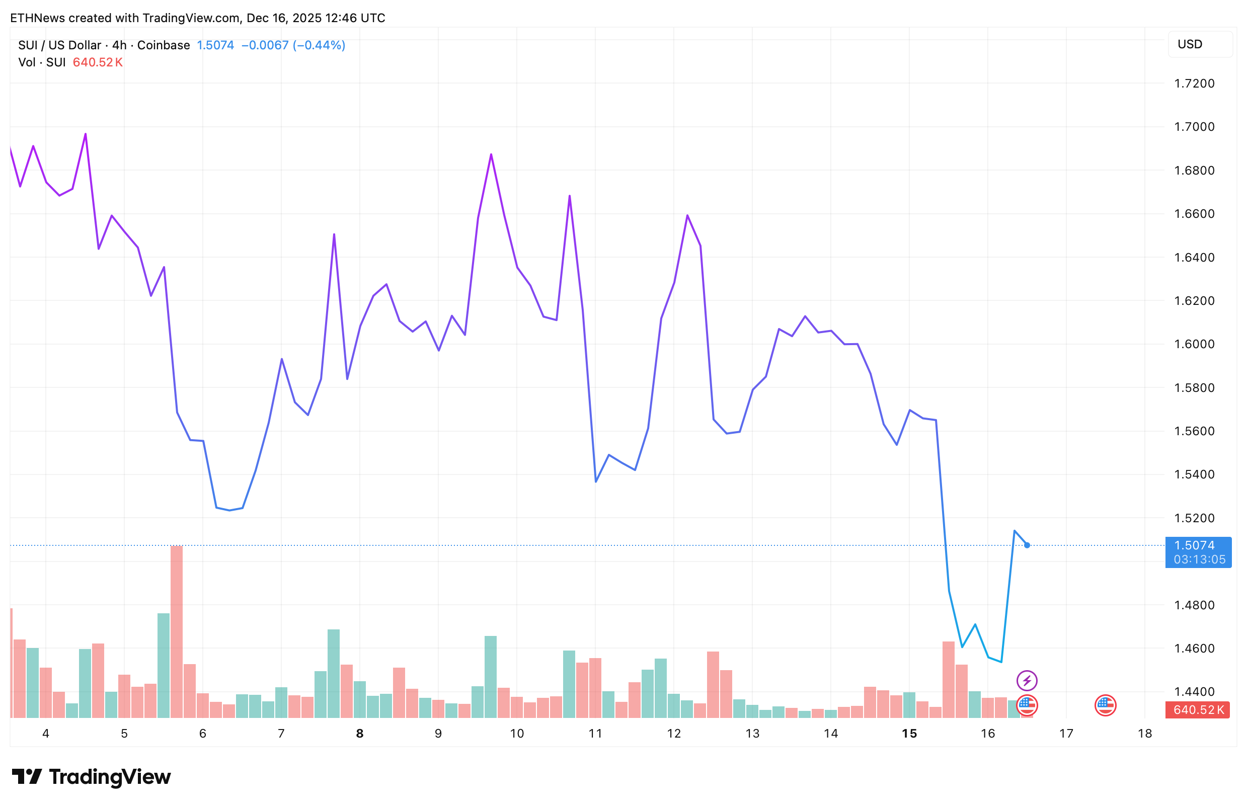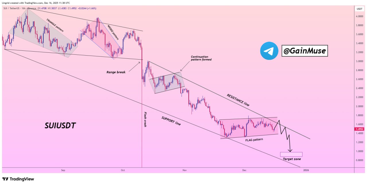Following the breakdown and flash crash, SUI entered a period of sideways consolidation along the lower boundary of the trend. The structure forming resembles a bearish flag, a pattern typically associated with continuation rather than trend exhaustion.