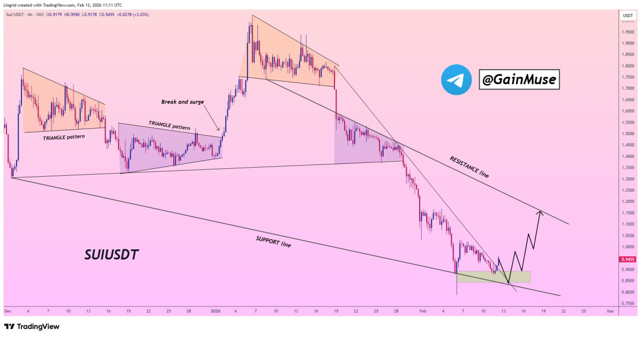 This behavior aligns with the structure outlined by crypto trader GainMuse, where SUI previously compressed inside a descending triangle. His chart highlights sustained pressure from descending resistance, followed by a decisive volatility expansion that resolved the compression phase and pushed price into a lower structural range.