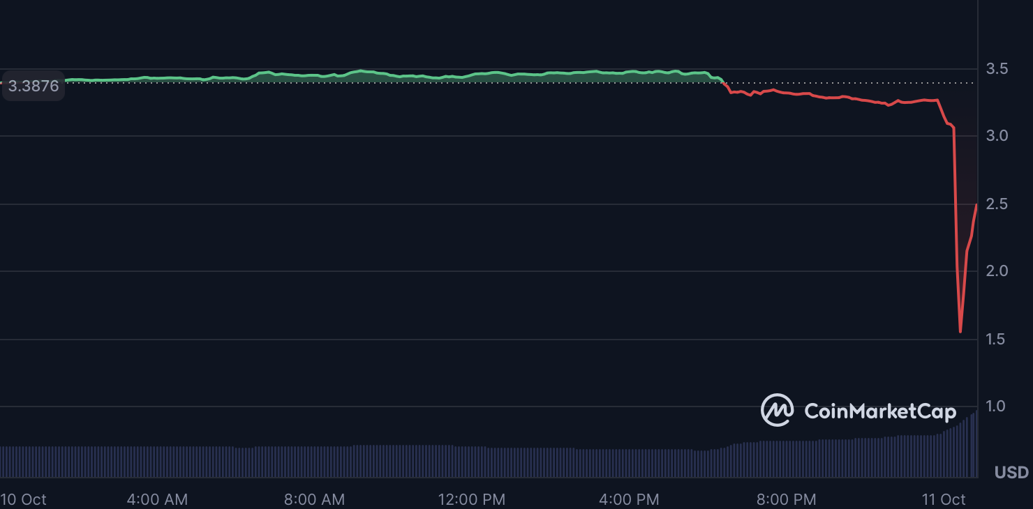 The token briefly crashed to around $1.60 before rebounding sharply, mirroring the chaotic price swings seen across the market after President Trump’s 100% tariff announcement on Chinese imports.
