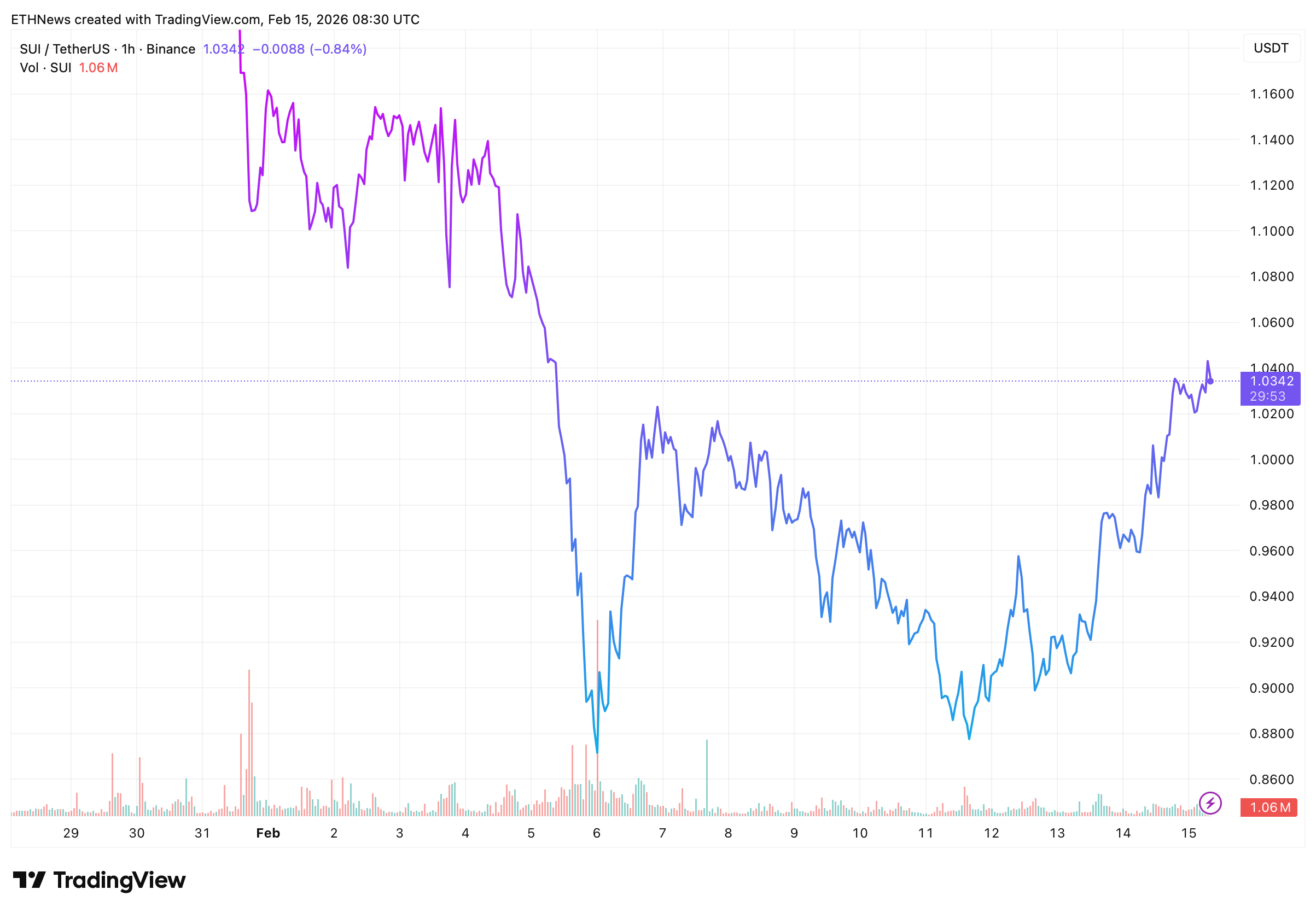 On the 1-hour SUI/USDT chart, price is trading around $1.0342. The recent structure shows a recovery from the February 11–12 lows near $0.88–$0.90, followed by a sequence of higher lows and a push into prior resistance.