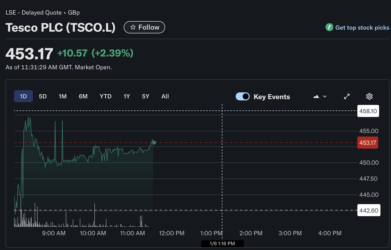 Tesco (TSCO.L) shares moved higher on January 6, 2026, trading around 453 GBX by midday, as investors reacted positively to early data pointing to a strong holiday season and continued market share gains.