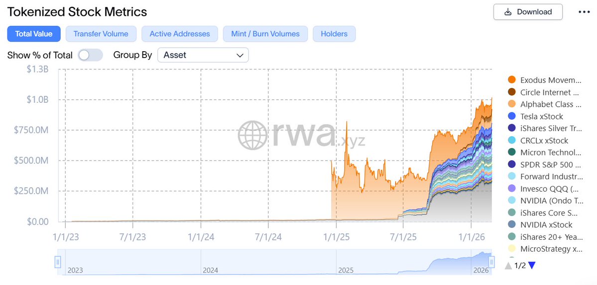 The total value of tokenized stocks has officially crossed the $1 billion mark, highlighting accelerating demand for on-chain exposure to traditional equities.