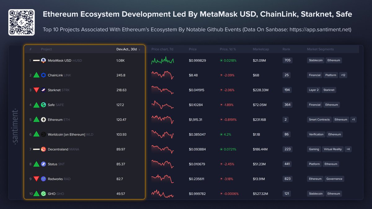 MetaMask USD leads the ranking with the highest 30-day development activity score, followed by Chainlink and Starknet. Ethereum itself ranks fifth on the list.