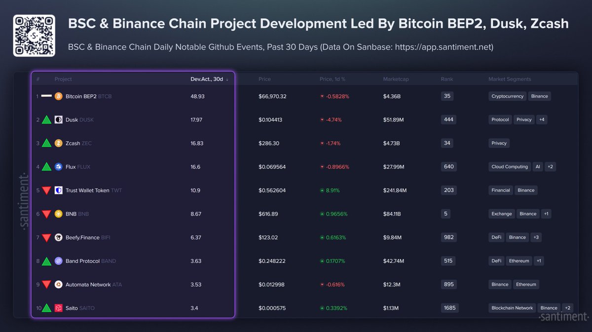 After reviewing the latest development activity data shared by Santiment, one detail stands out immediately: Bitcoin BEP2 (BTCB) is leading all BSC and Binance Chain projects in GitHub activity over the past 30 days.