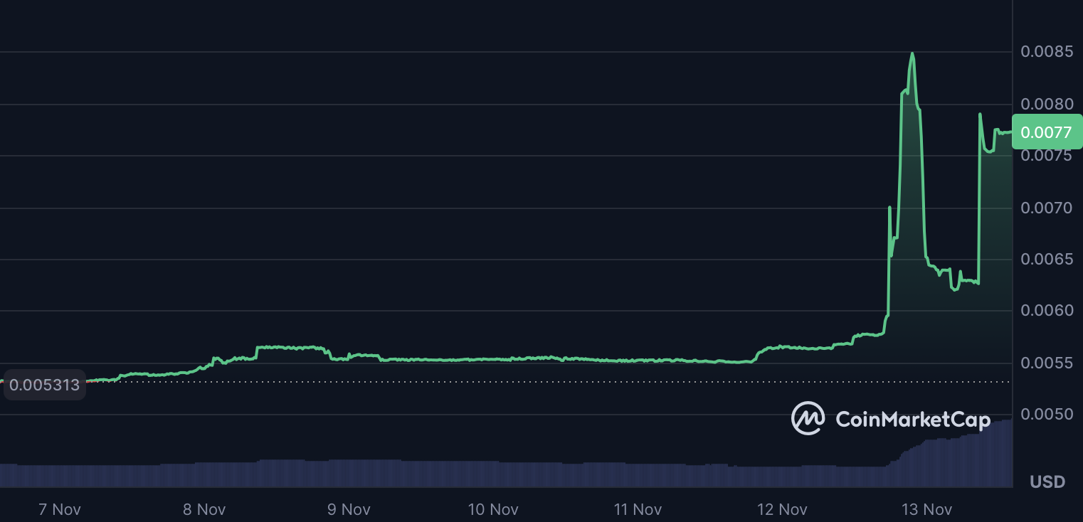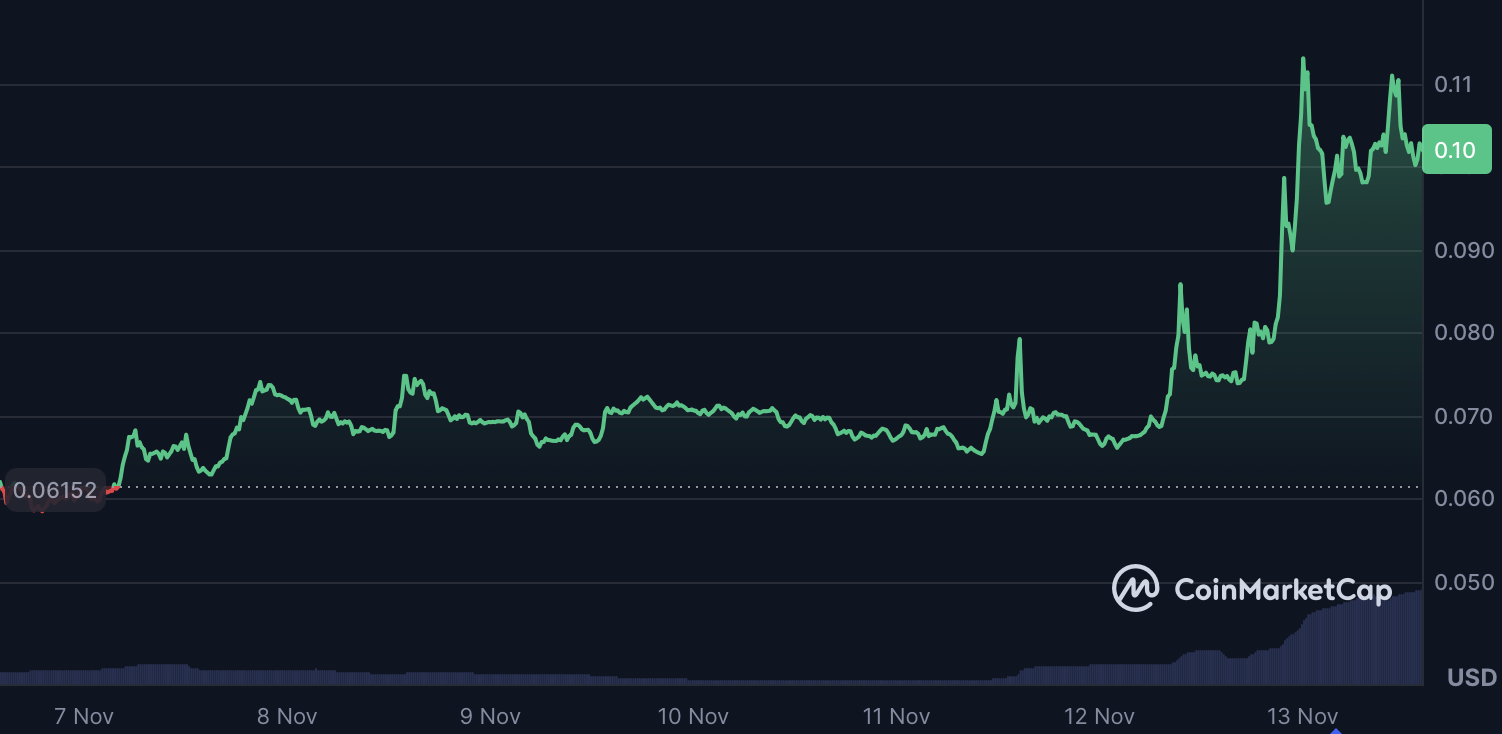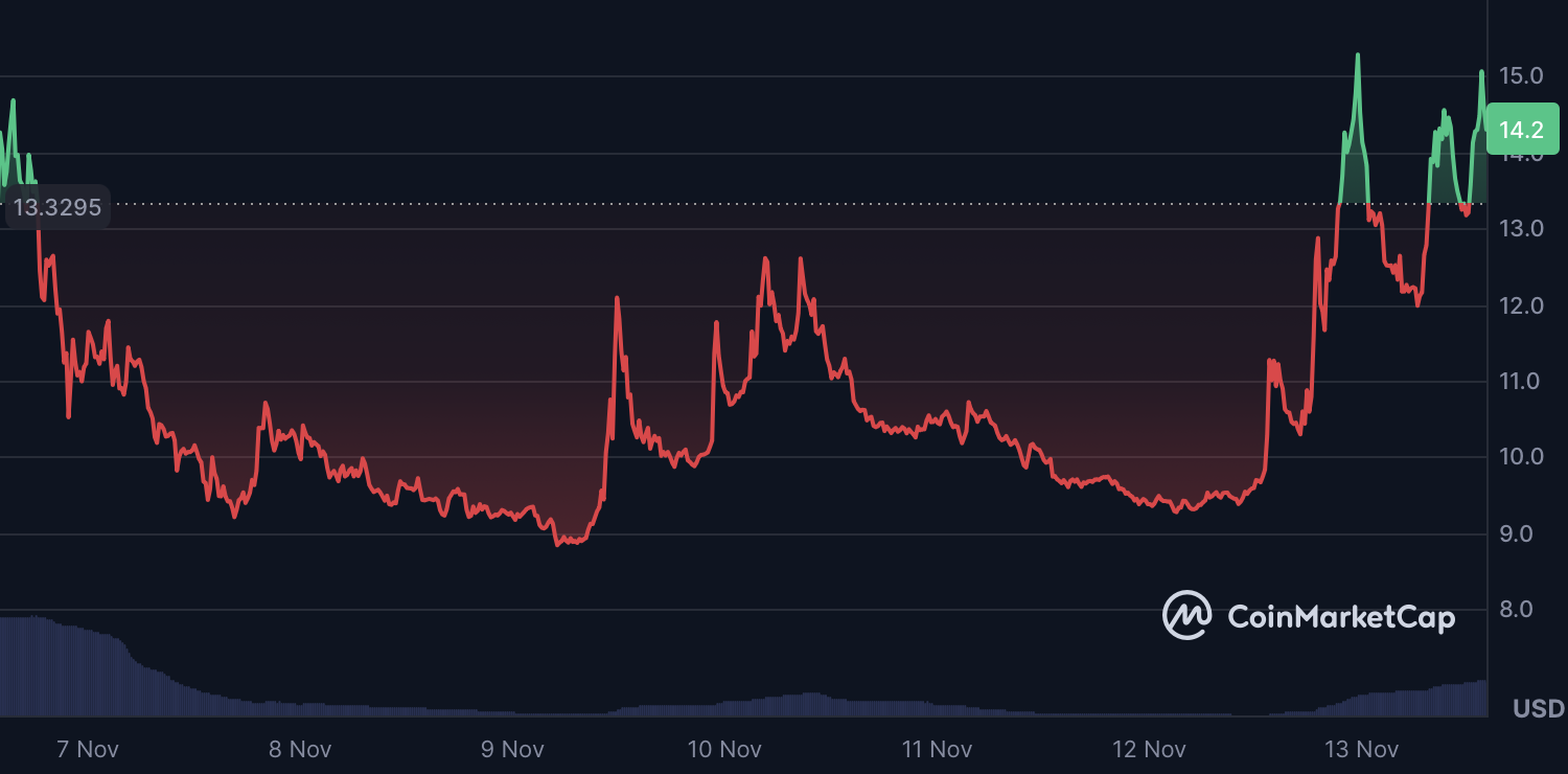 AB jumped 33.8% in 24 hours, extending its weekly advance to 45% with a market cap of $668.5 million. The move followed its partnership with World Liberty Financial to deploy the USD1 stablecoin directly on the AB Chain, announced on November 12, 2025.