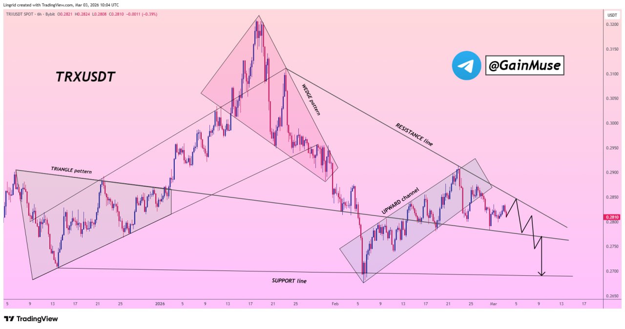 TRX/USDT is trading at $0.2810 on March 3, 2026, after failing to hold above its rising channel and facing rejection beneath descending resistance, with analysts identifying $0.27 as the breakdown level and $0.2950 as the invalidation point.