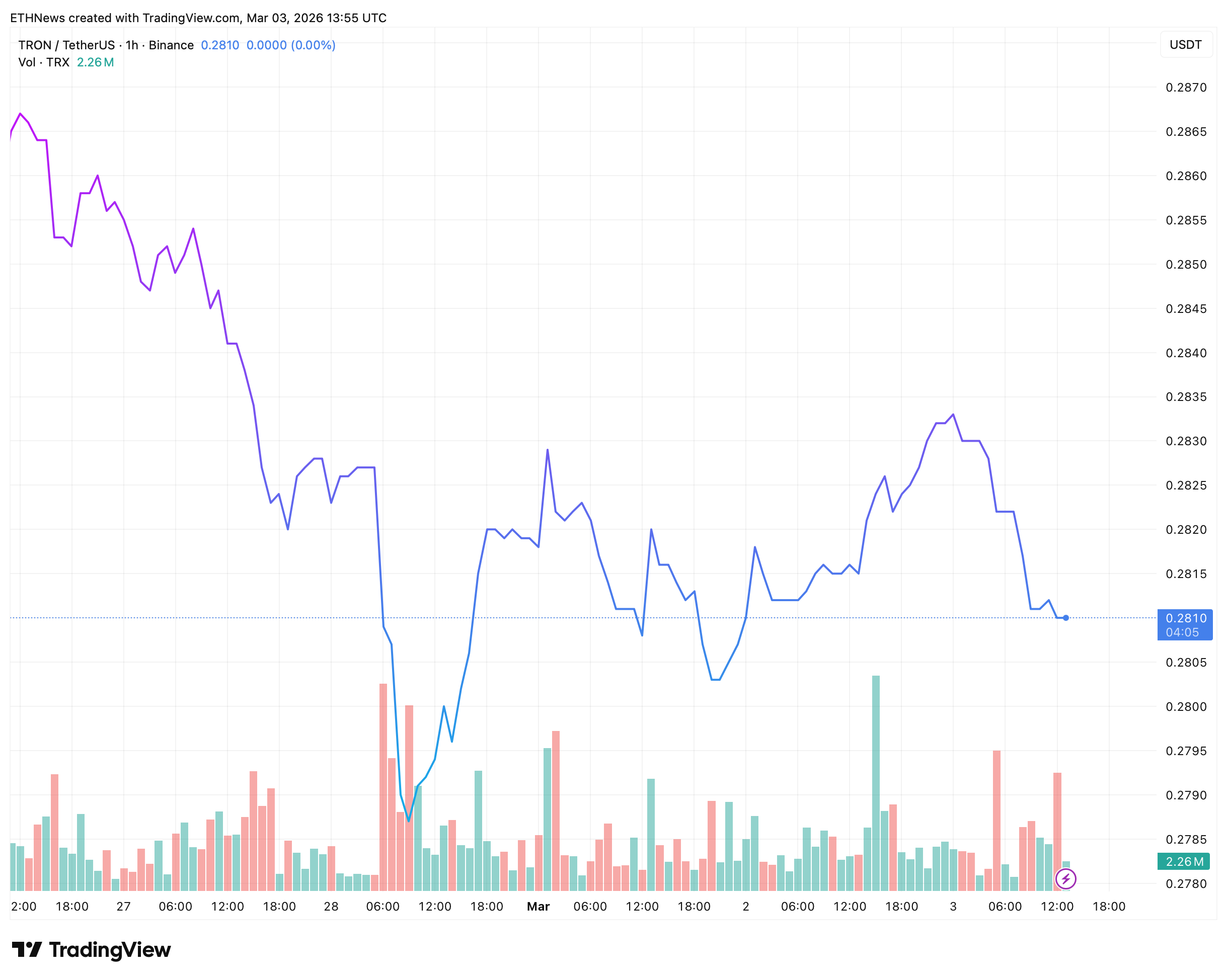 TRX opened the period near $0.2870, declined through February 26 and 27, then dropped sharply on February 28 with the highest volume bars on the chart. Price fell from $0.2830 to near $0.2790.