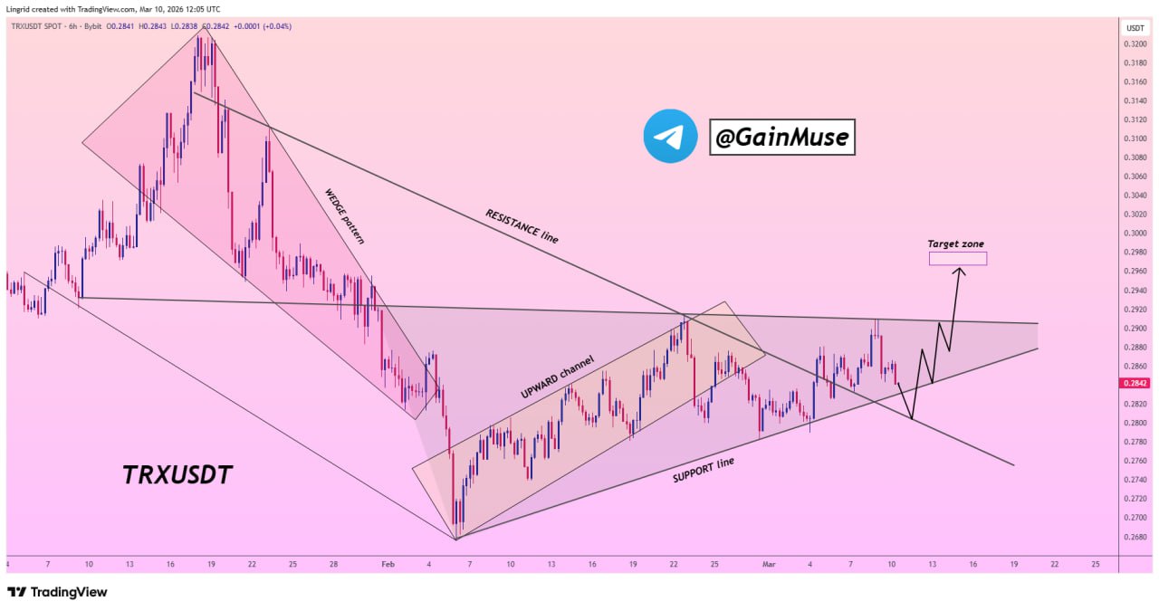 The mid-range resistance area sits between $0.286 and $0.290. Price is attempting to reclaim it right now after the March 9 rejection. How TRX handles this zone over the next 24 to 48 hours will clarify whether the channel structure is building toward a breakout or rolling over into a deeper retest of support.