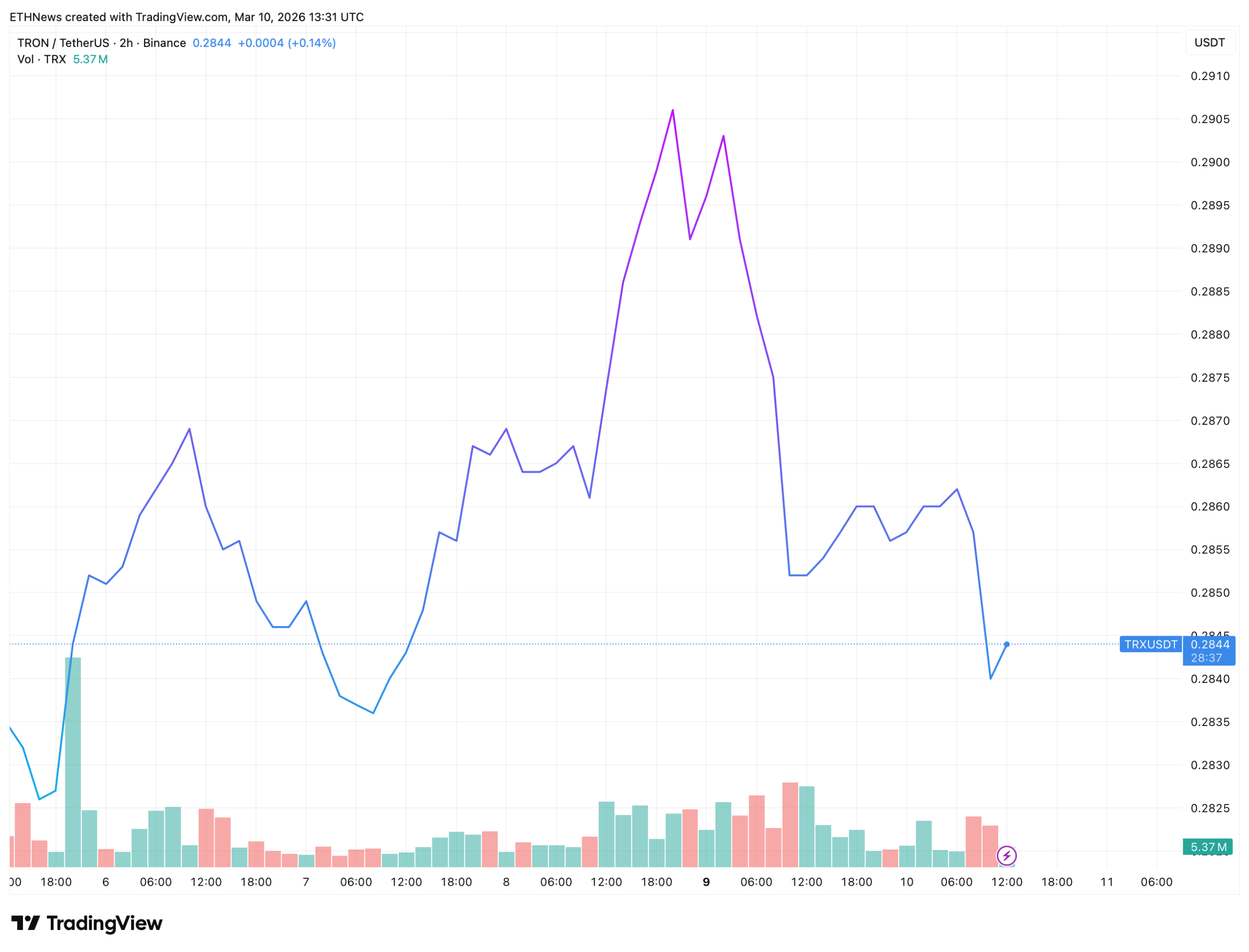 TRX spiked sharply to $0.2908 on March 9 before sellers stepped in hard, pulling price back toward $0.2840 within hours. That rejection at $0.290 was the second time in the current range that level has capped the move. The speed of the reversal matters. A genuine breakout through resistance does not typically retrace 70 basis points in a single session. What happened on March 9 looks more like a liquidity grab above resistance than a sustained directional move.