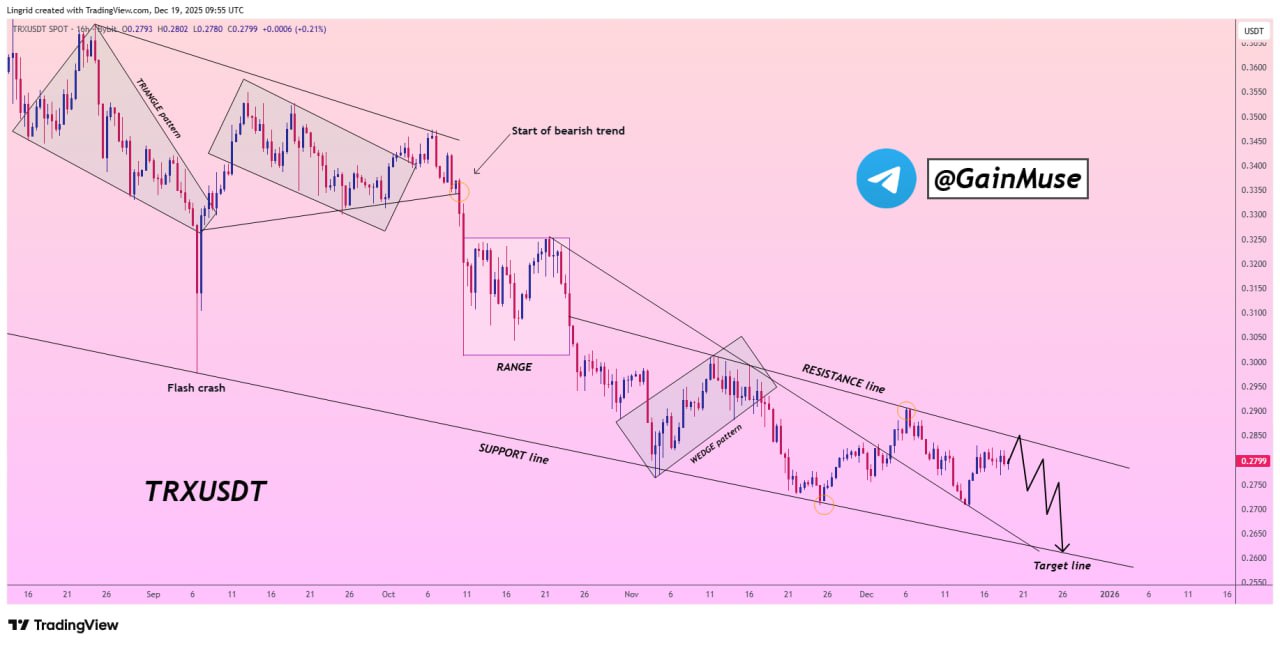 The chart from Gain Muse highlights a clearly defined descending channel that has governed TRX price action since the start of the bearish phase. After an initial sharp selloff, price transitioned into a sequence of lower highs and lower lows, confirming trend continuation rather than a temporary correction.