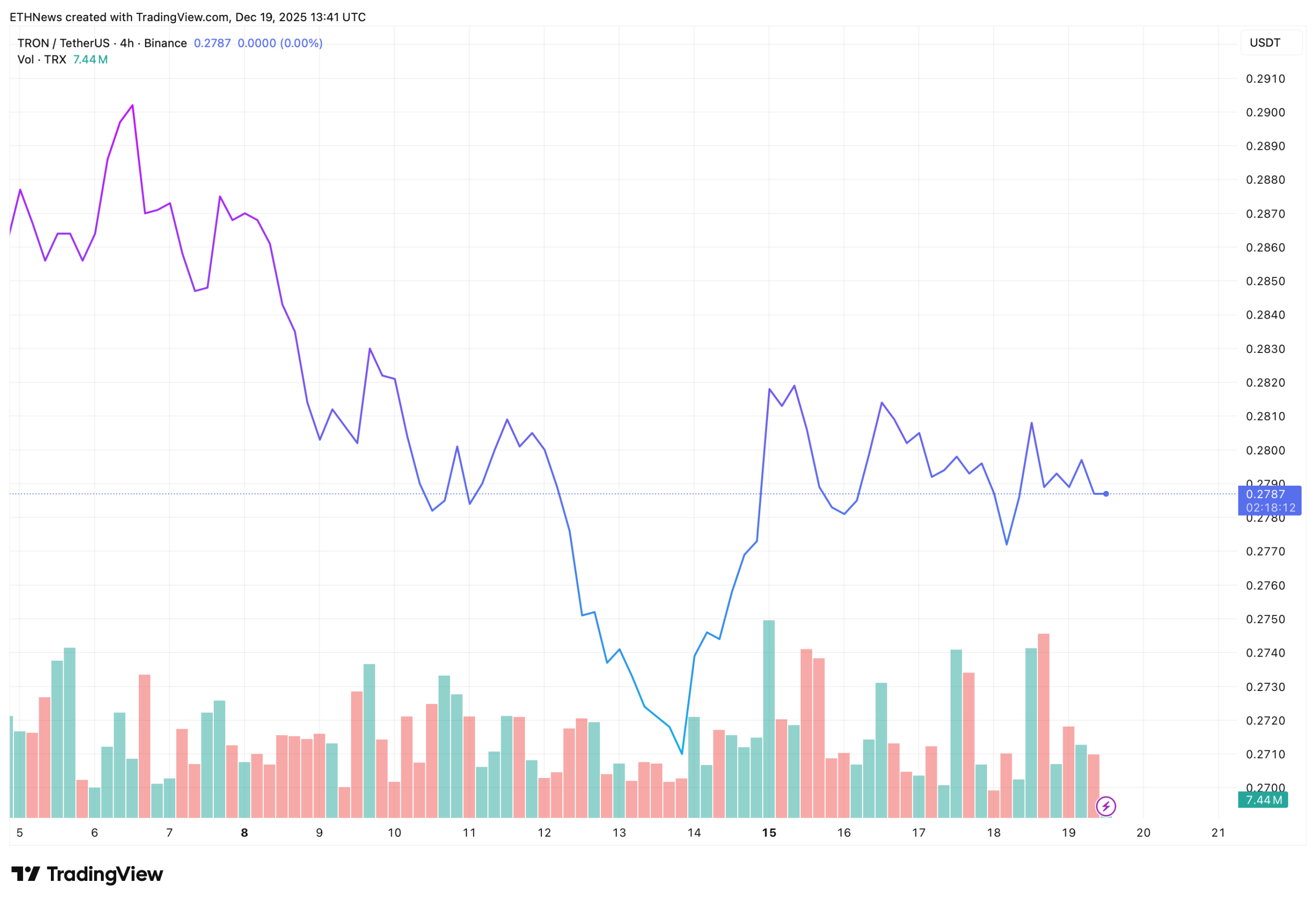 The 4-hour chart aligns with this view. After declining from the $0.29 area, TRX found temporary support near $0.27 before rebounding modestly. That bounce, however, stalled quickly and transitioned into sideways movement around the $0.278 region.
