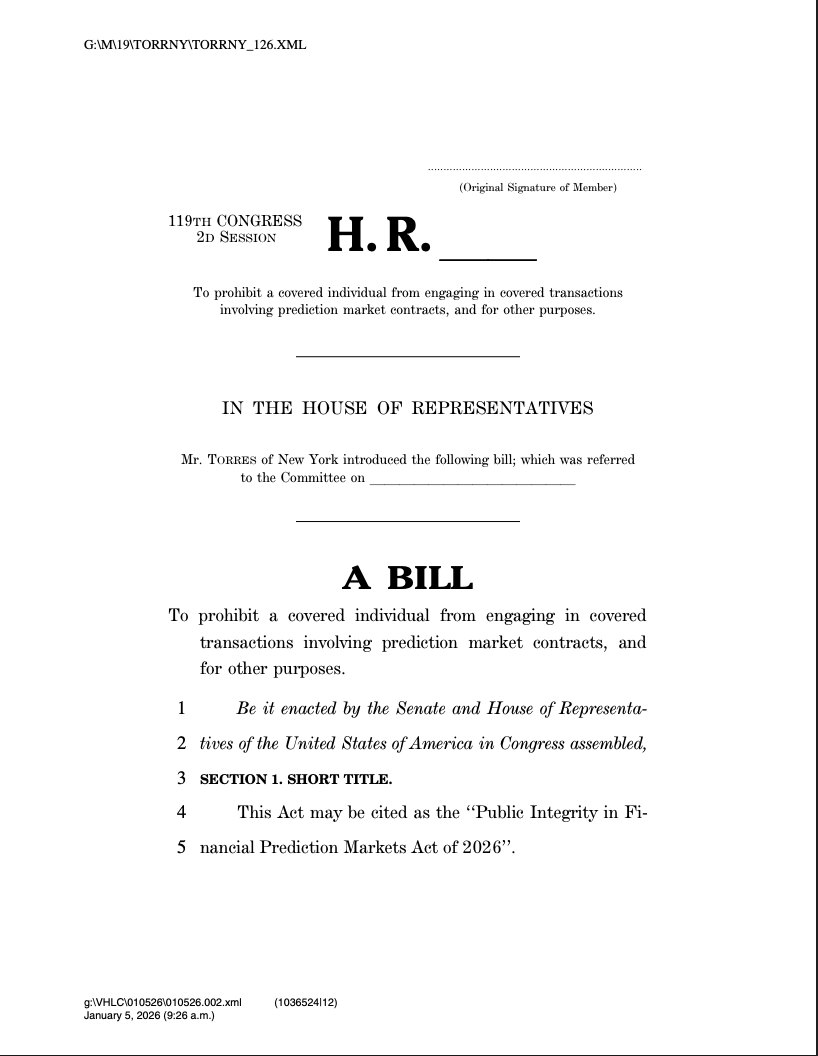 The legislation is titled the “Public Integrity in Financial Prediction Markets Act of 2026.” It was introduced during the 119th Congress, 2nd Session, and has been referred to committee for further consideration.