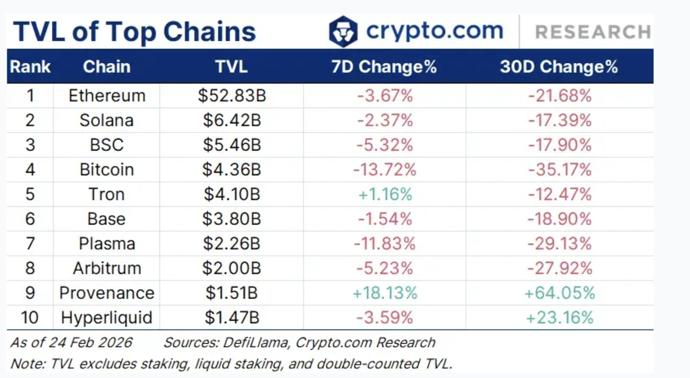 Ethereum remains the dominant network with approximately $52.8 billion in TVL, though it is down around 3.7% over the past 7 days and more than 21% over 30 days.