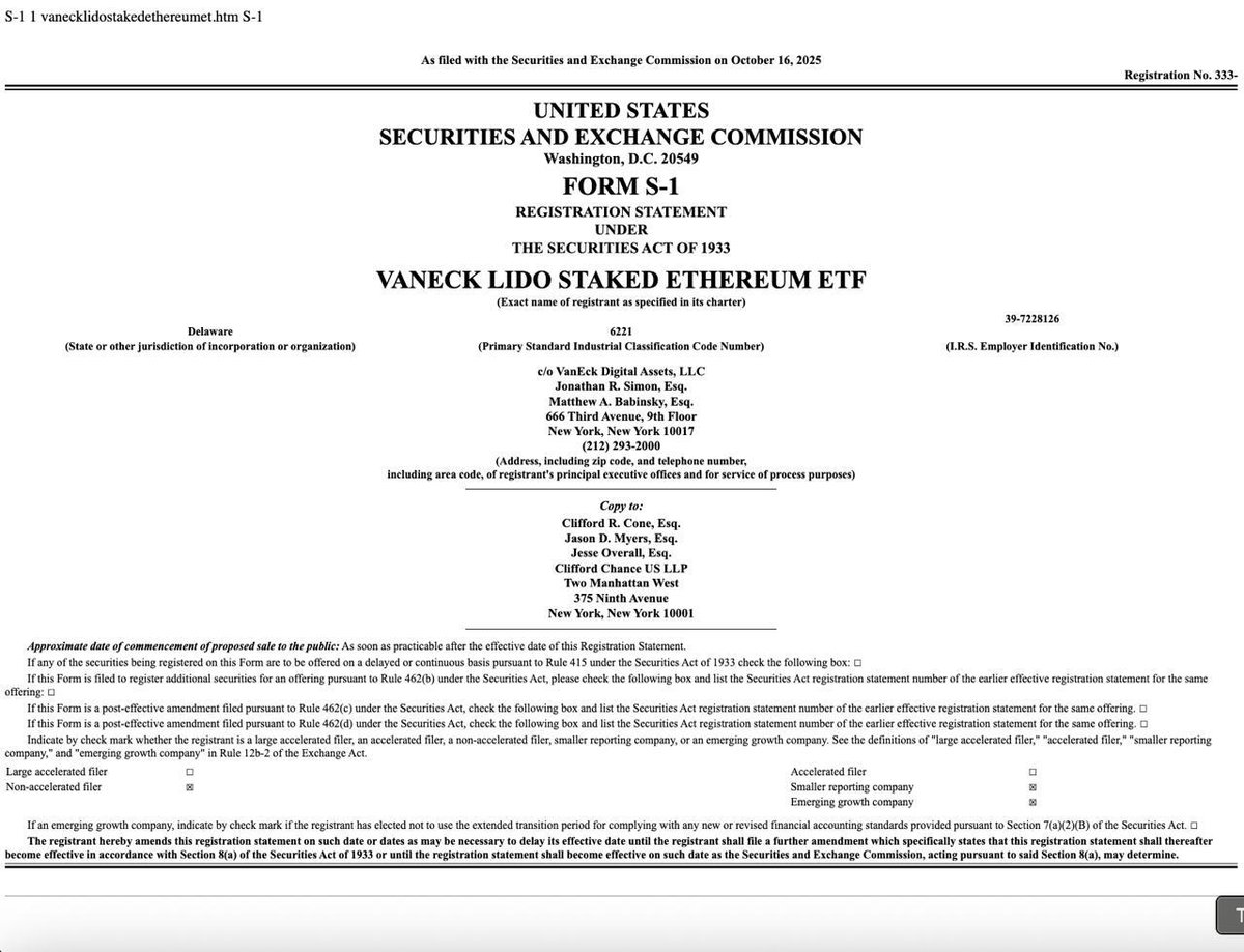 VanEck has officially submitted an S-1 registration statement to the U.S. Securities and Exchange Commission (SEC) for the VanEck Lido Staked Ethereum ETF, marking the first U.S. exchange-traded fund proposal designed to provide investors with exposure to Lido’s stETH, Ethereum staked via the leading liquid staking protocol.