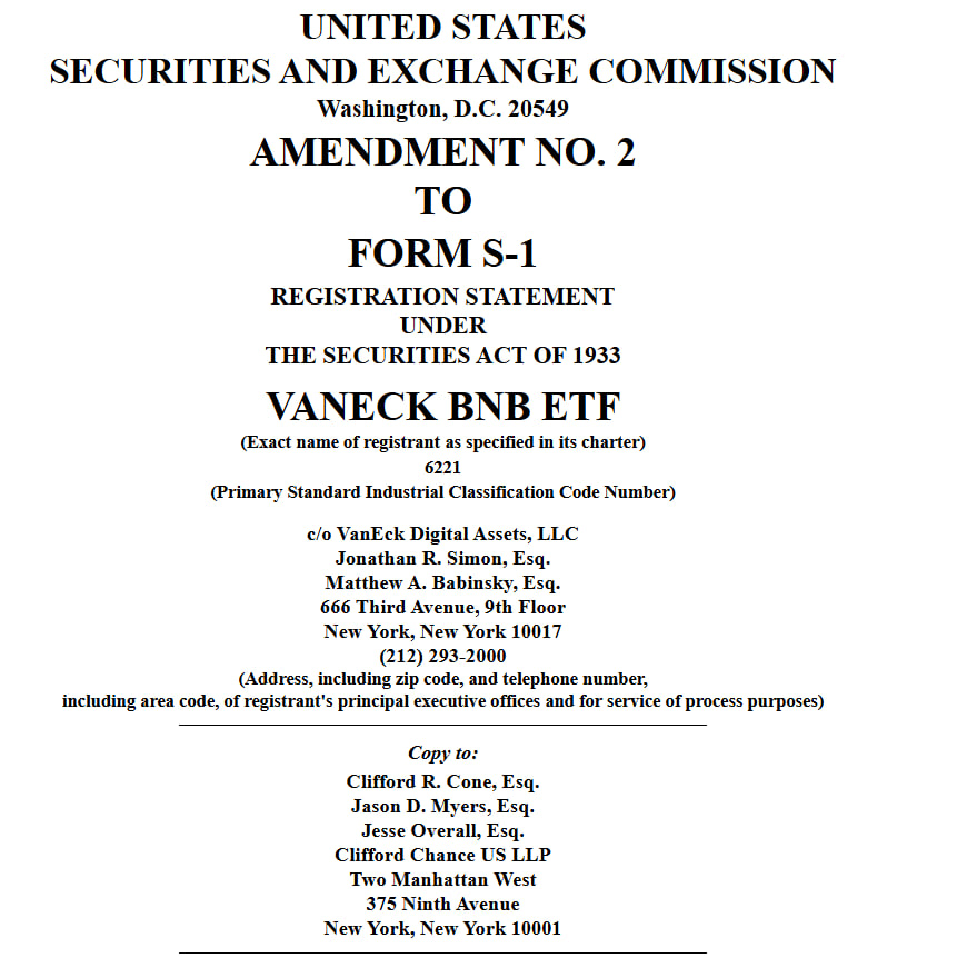 VanEck has officially submitted an updated registration to the U.S. Securities and Exchange Commission (SEC) seeking approval to launch a spot BNB exchange-traded fund. The product, named VanEck BNB ETF (VBNB), would hold Binance Coin (BNB) directly, marking the first formal attempt to bring a spot BNB product to U.S. markets.