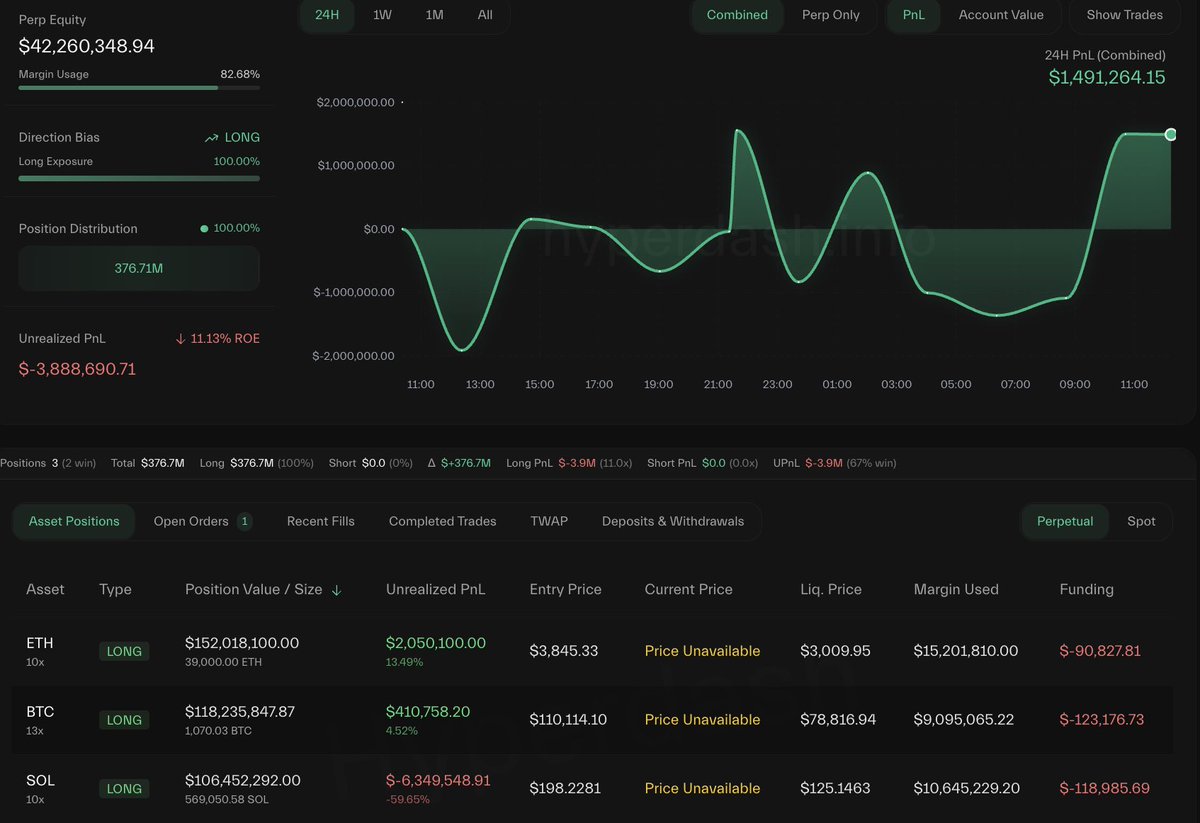 The trader, whose positions are tracked on Hyperliquid, currently holds a combined $376 million in long positions, allocating $152 million to Ethereum (ETH), $118.2 million to Bitcoin (BTC), and $106.4 million to Solana (SOL).