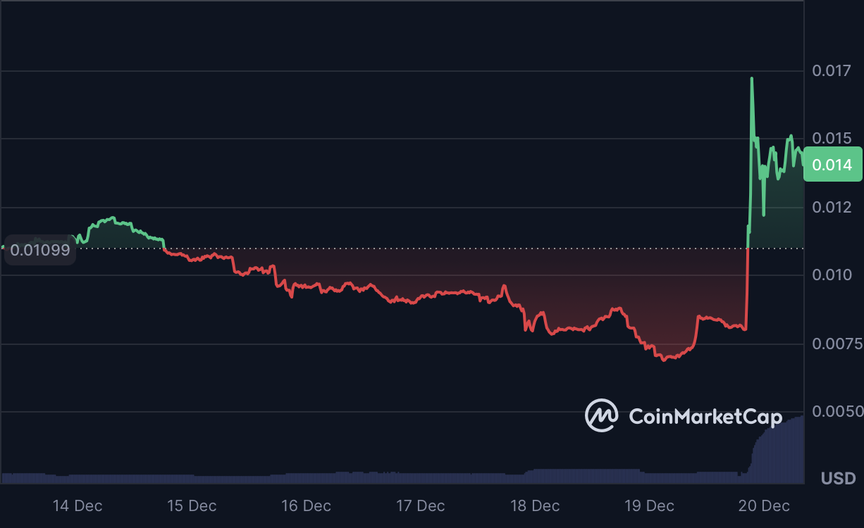 Trading volume jumped 499% in one day, a classic signal of speculative inflows into low-cap tokens. The move occurred while broader markets were under pressure, with Bitcoin down 1.9% and Ethereum down 3.8% over the same period.