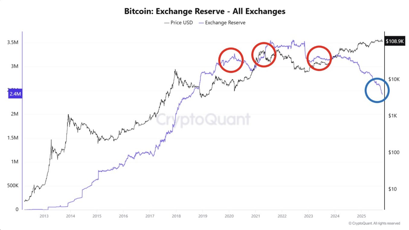 In the 2017 and 2021 bull markets, reserves surged just before major corrections, as marked by the red circles on the chart. However, in 2025, reserves have hit their lowest level in years, represented by the blue circle, indicating that holders are unwilling to sell even during periods of heightened volatility.