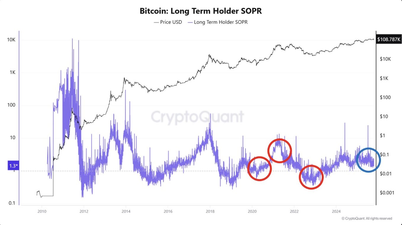 In the current cycle, SOPR remains remarkably stable, showing minimal profit-taking despite recent price swings. This suggests that long-term investors are holding firm and accumulating rather than exiting positions. CryptoQuant notes that this consistency contrasts sharply with previous cycles, when SOPR spikes preceded major sell-offs.
