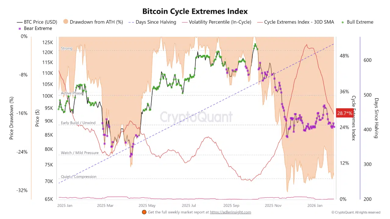 The Bitcoin Cycle Extremes Index further supports a cooling narrative. The index currently sits around 28–30%, placing it firmly in the mid-range and well below historical bull-market extreme zones. Bull extreme signals that were visible during the Q3 rally have weakened noticeably, while bear extremes remain scattered and unclustered.