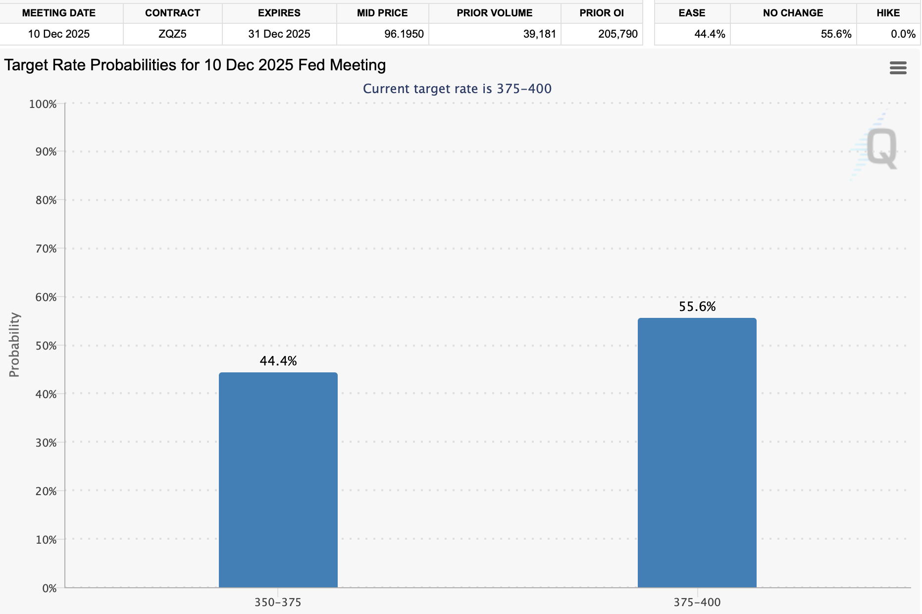 Because fresh macro numbers have been missing, investors have been revising expectations based on sentiment instead of statistics. The CME FedWatch tool shows how fast the mood has changed. Where markets once saw a December rate cut as the base case, probabilities have flipped: