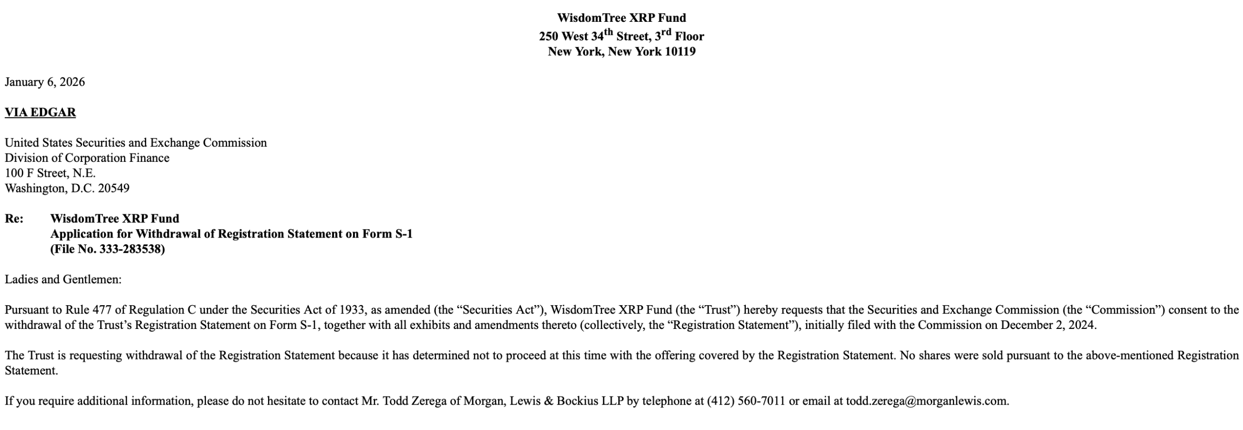 WisdomTree has withdrawn its registration statement for a spot XRP exchange-traded fund (ETF) with the U.S. Securities and Exchange Commission, effective January 6, 2026, according to regulatory filings.