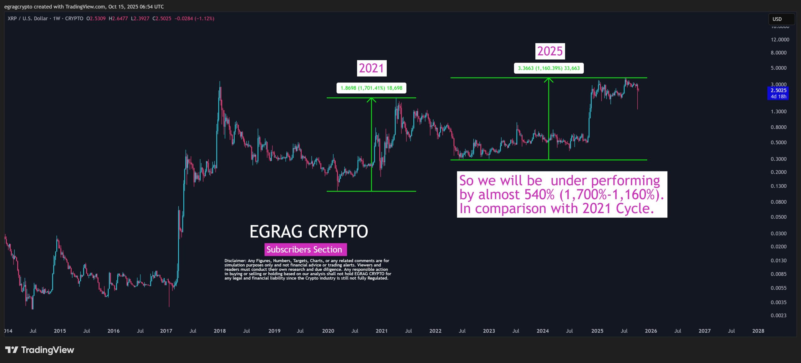 EGRAG drew parallels to XRP’s 2021 cycle, when the token surged roughly 1,700% from its lows. So far, this cycle has only produced a 1,160% increase, a performance he views as incomplete.
