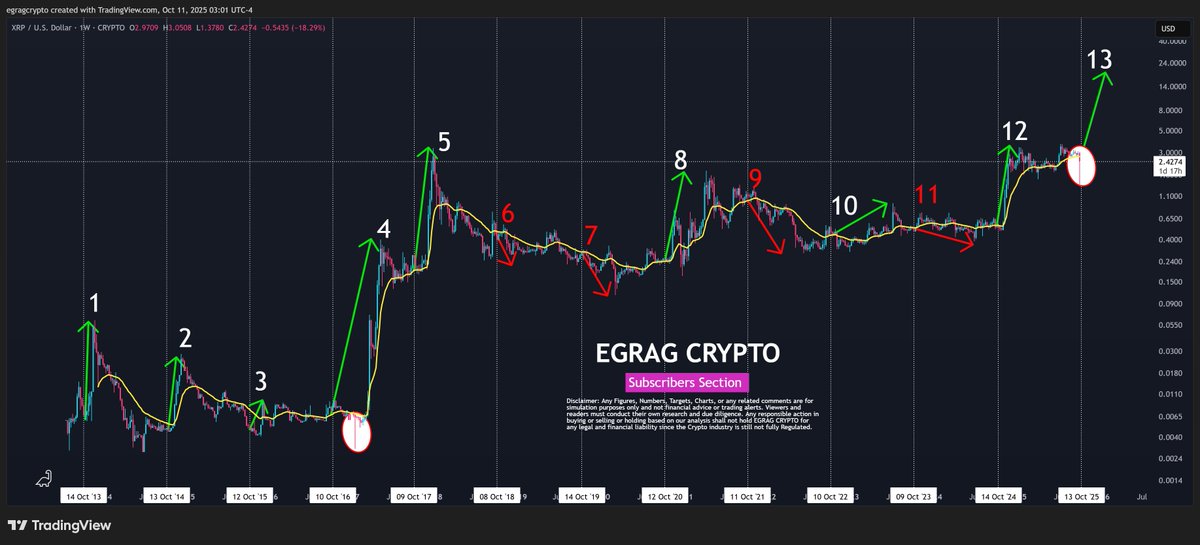 Chart data shared by the analyst highlights a recurring cycle of capitulation followed by relief rallies in October, a pattern visible since XRP’s early trading history. Based on this cyclical behavior, EGRAG suggests that XRP could see renewed momentum once market sentiment stabilizes.