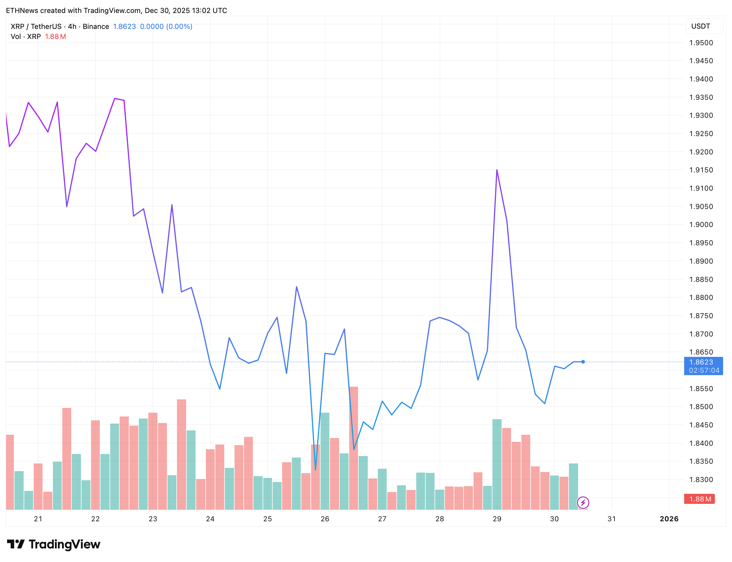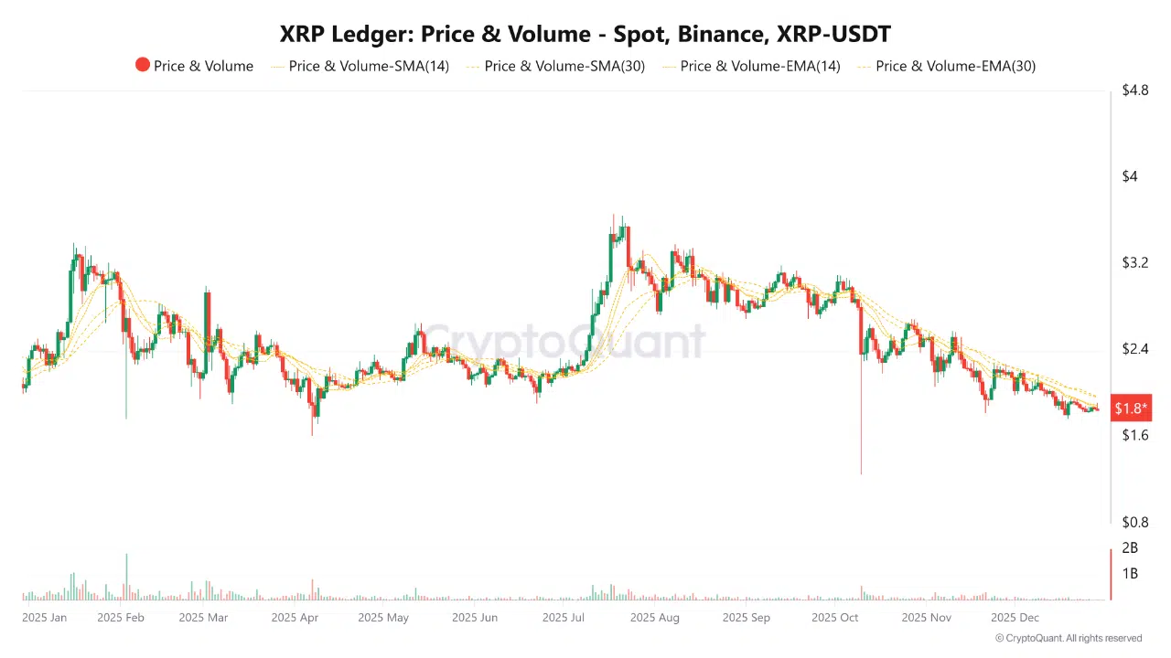 The latest data shows XRP trading around $1.8, hovering just above a critical support zone that has become the market’s immediate focus.