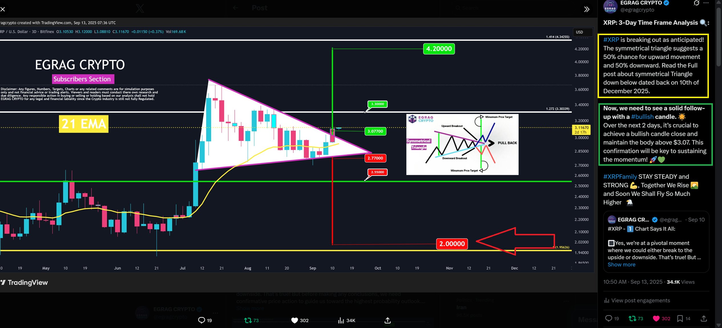 XRP is approaching a decisive moment on the charts, according to crypto analyst EGRAG Crypto, who highlighted key price zones that could define the asset’s next big move. In his latest 3-day timeframe update, he explained that while XRP’s recent symmetrical triangle retest failed to produce an immediate breakout, the technical setup still favors a potential recovery if support holds steady.