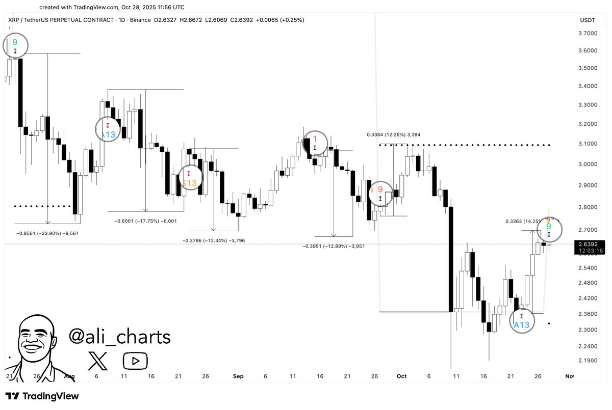 Analyst Ali Martinez noted on X that the TD Sequential indicator, which has accurately spotted XRP trend reversals over the past three months, has now flashed a sell signal on the daily chart.