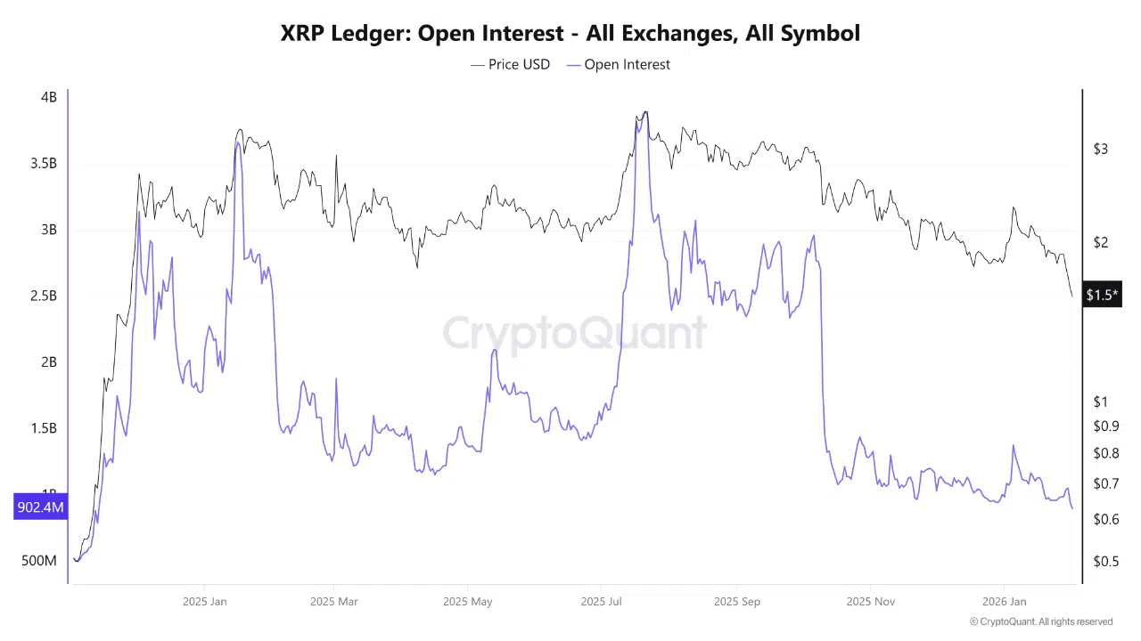 According to the CryptoQuant chart, open interest across all exchanges has fallen to approximately 902 million, its lowest level since 2024.