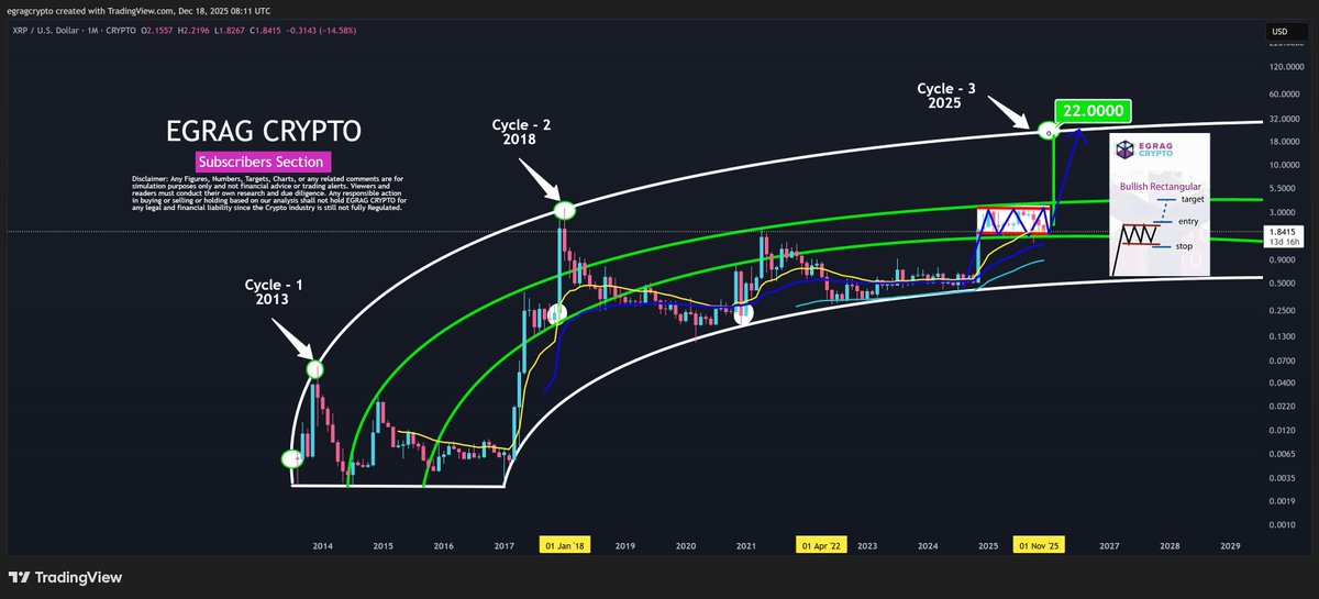 The long-range chart from EGRAG CRYPTO places XRP within a rising curved channel that has guided price action since the early market cycles. Three major cycle peaks are highlighted, 2013, 2018, and the projected 2025 zone, each occurring near the upper boundary of this structure.
