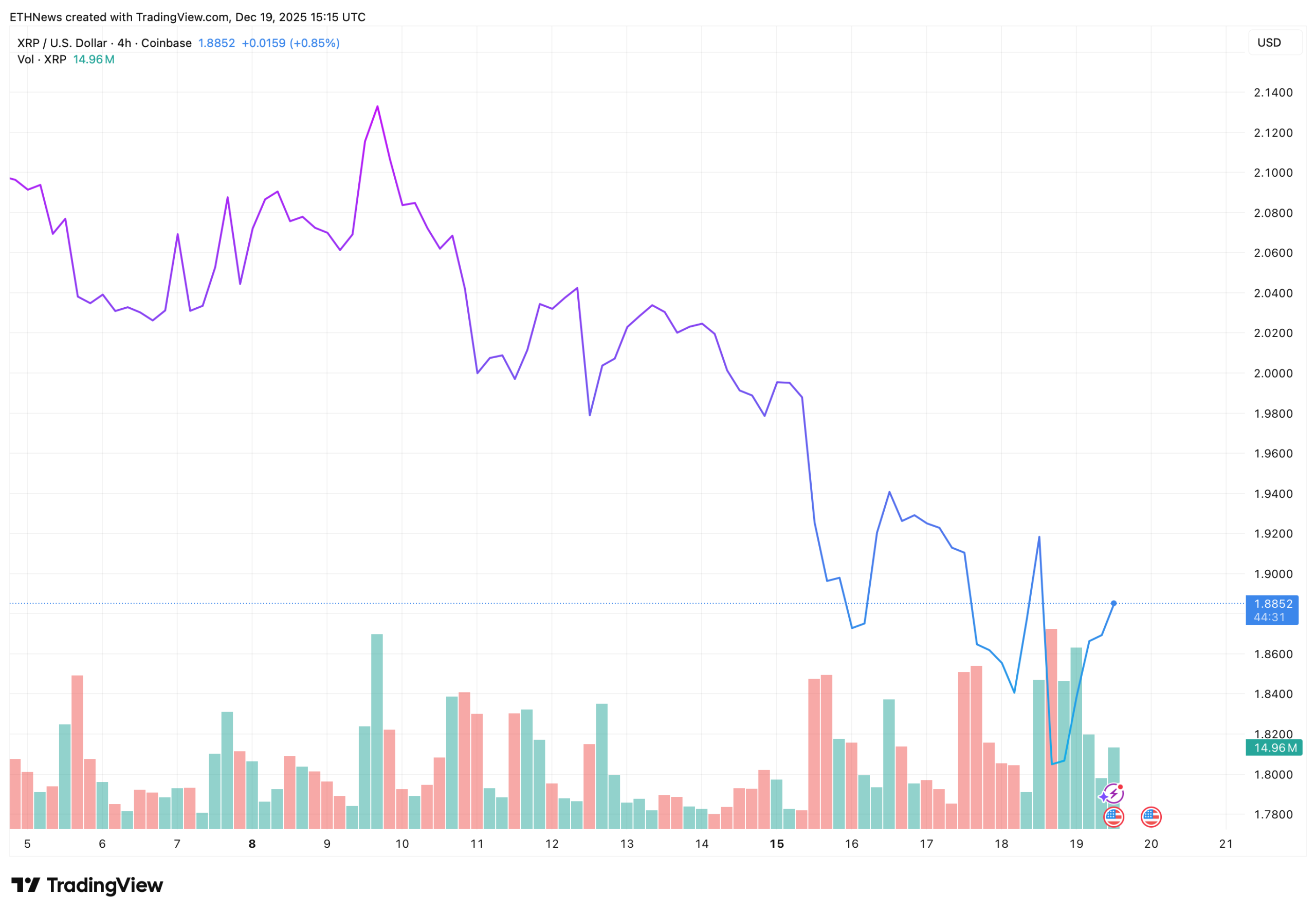The 4-hour chart captures the current pullback more clearly. XRP declined from above $2.10 before finding demand near the $1.82–$1.85 area. The rebound that followed lifted price back toward $1.88, but momentum remains uneven.