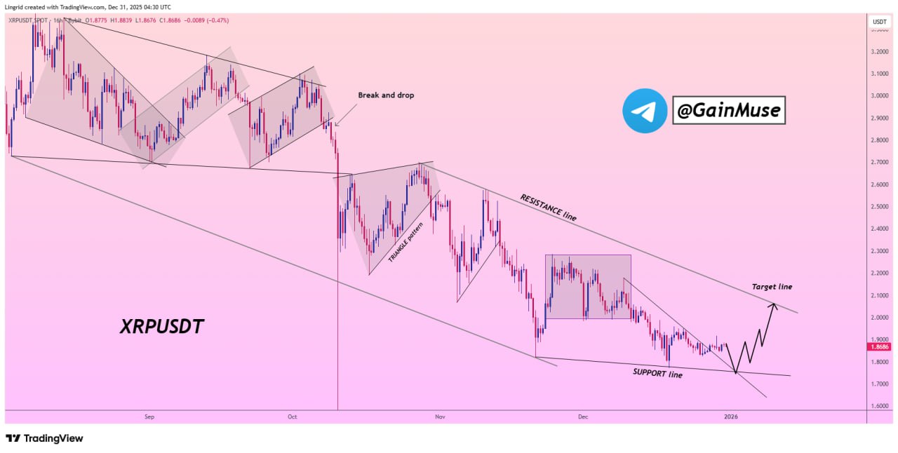 According to the structure outlined by Gain Muse, XRP is currently holding just above a fragile support base near the channel’s lower edge. Momentum indicators implied by price behavior suggest exhaustion rather than reversal. Without a decisive reclaim of broken resistance levels, downside continuation remains the dominant scenario.