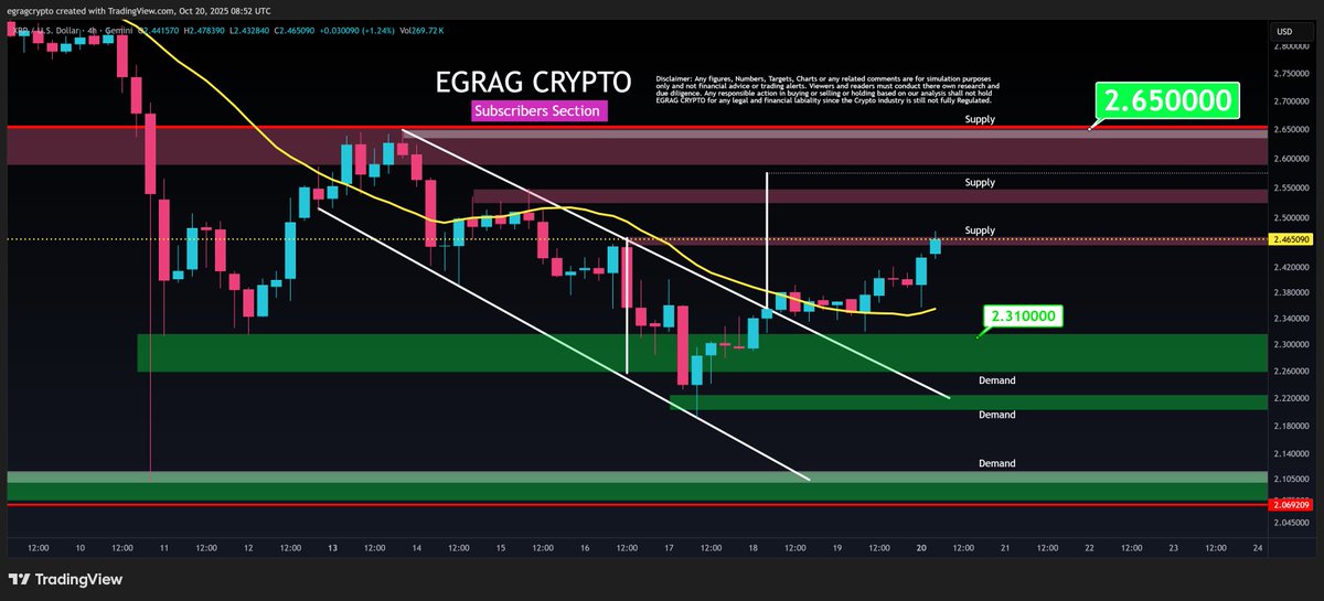 The chart indicates that a 3-day close above $2.65 would mark a strong breakout signal, potentially igniting a new macro bullish phase and cycle highs. However, a drop below $2.31 could invalidate the bullish setup and lead to a deeper correction.