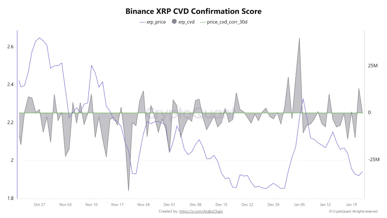 The real warning sign would be a rising XRP price paired with falling correlation or increasingly negative CVD, that would suggest hidden weakness. For now, that divergence hasn’t appeared.