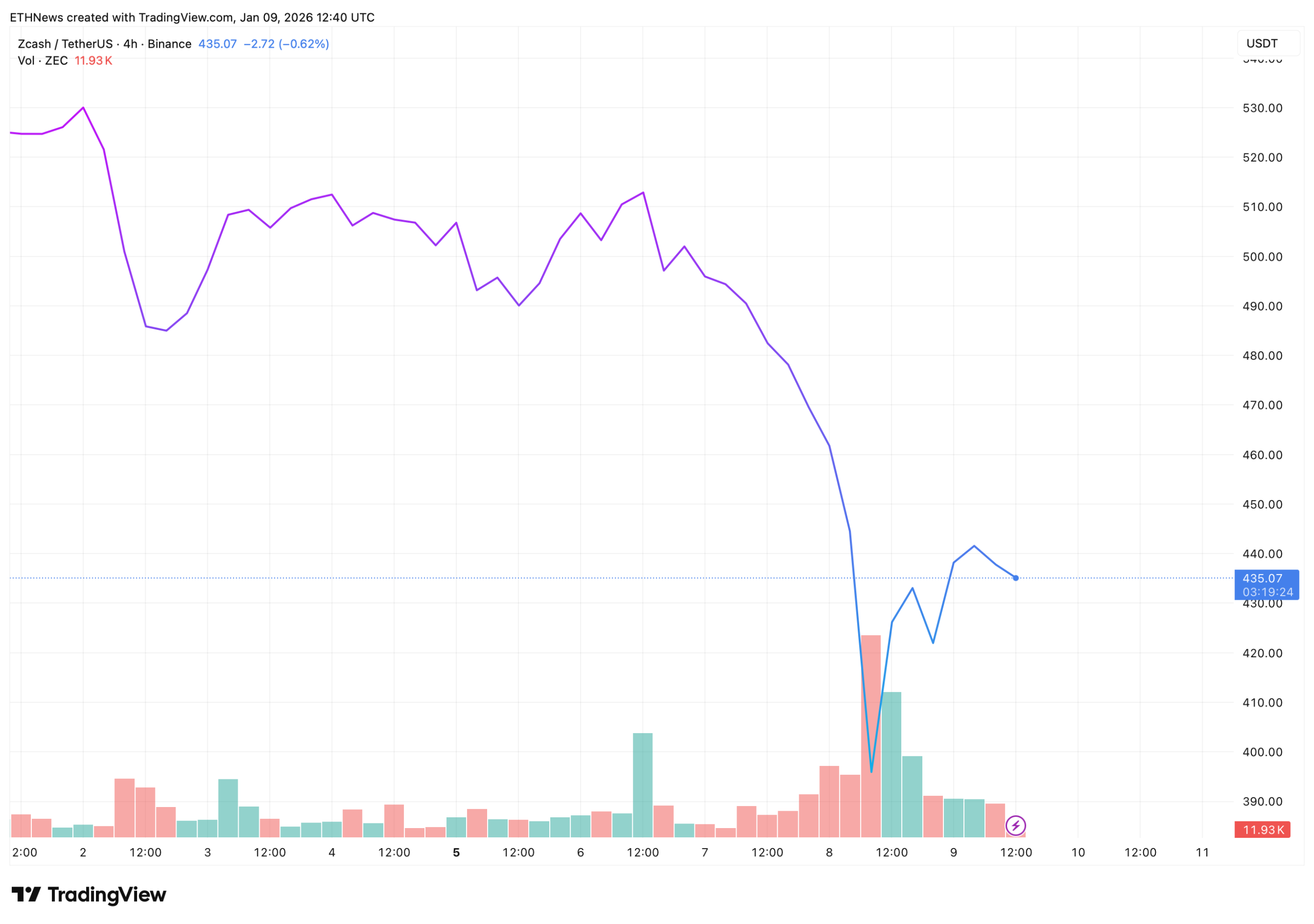 The token plunged more than 20% in the immediate aftermath of the announcement on January 8, briefly collapsing to around $390 before stabilizing. At the time of writing, Zcash was trading near $435, down roughly 12% over the past 7 days.