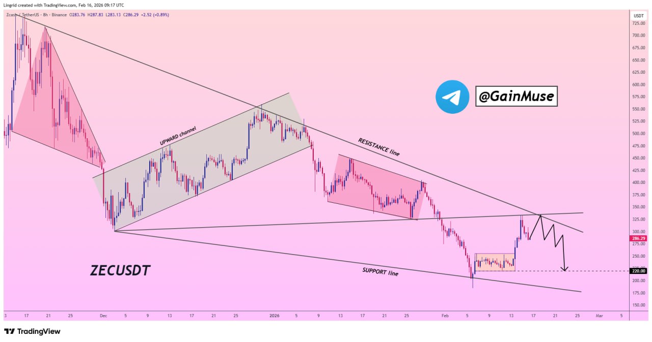 The chart, shared by crypto trader GainMuse, highlights a multi-phase structure that began with a wedge breakdown, transitioned into an upward corrective channel, and then resolved back into a broader descending trend. After losing horizontal support in late January, ZEC accelerated lower until reaching the macro support line around $220.