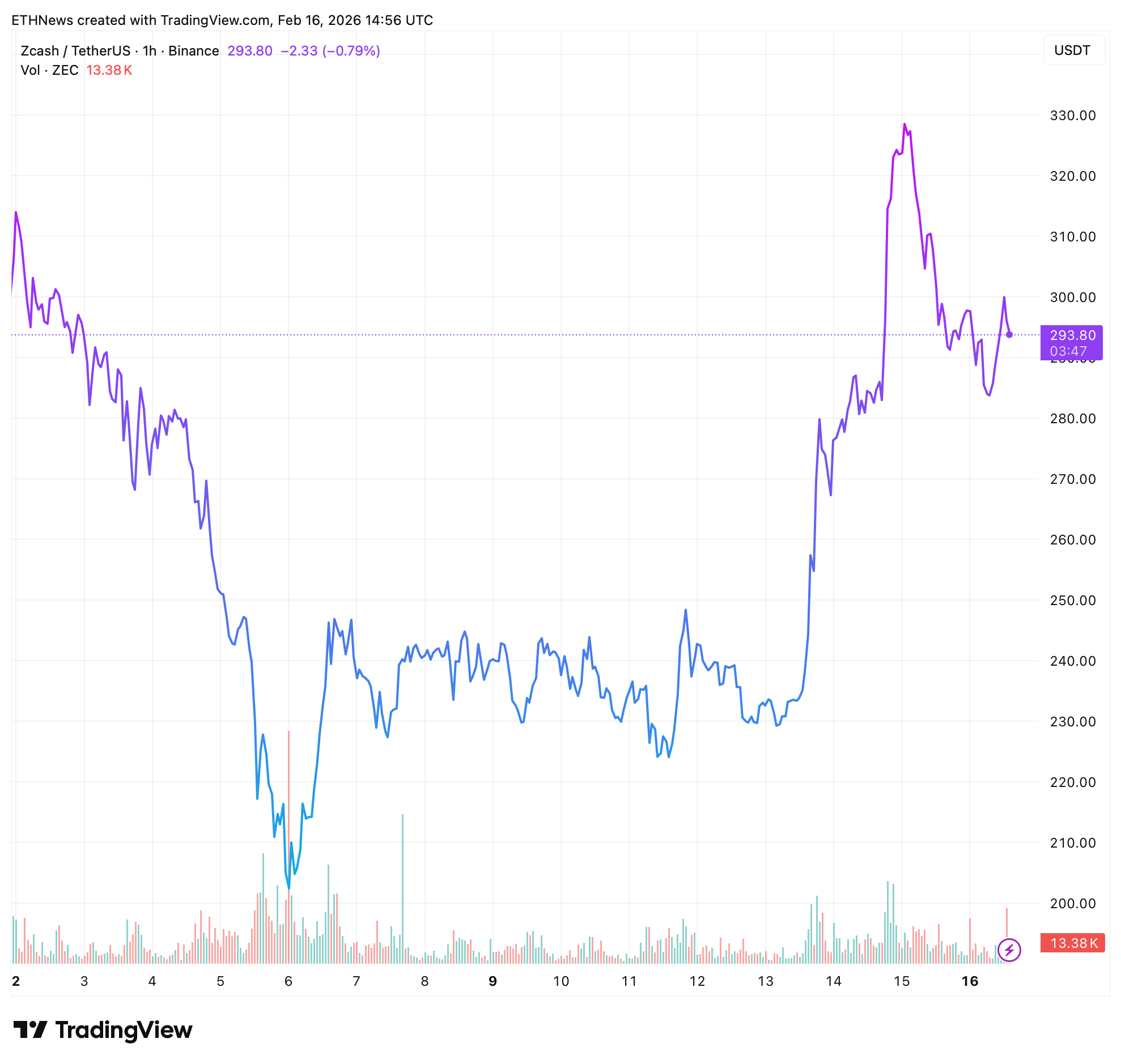 On the 1-hour TradingView chart, ZECUSDT is trading at $293.8, stabilizing just under the diagonal resistance that has capped upside attempts throughout the recent decline.